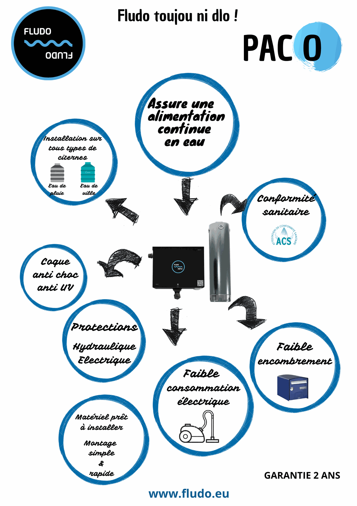 Le PacO assure une alimentation en eau continue de la maison. Prêt à poser, le Paco est un système de commande pouvant être fixé sur la tuyauterie ou au mur. Le Paco pilote automatiquement tout type de pompes (immergée ou non) et contrôle le bon fonctionnement du système. Il intègre toutes les protections nécessaires à la conformité d’une installation et garantie la longévité du produit.